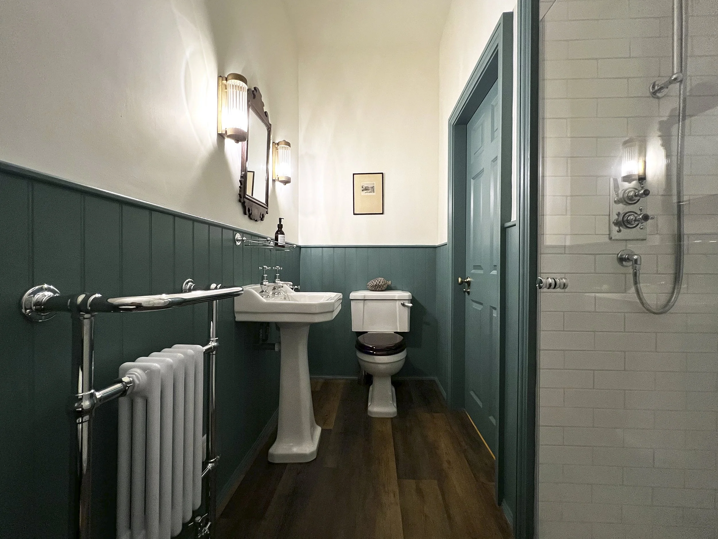 Barbican is a lovely surprise of a bedroom with rustic, exposed timber trusses, a sloping ceiling and a wonderfully cosy feel that belies the room’s size. Located on the second floor, Barbican is the largest bedroom in the house and is laid out as a generous twin although the beds can be combined to form a superking. There is also a sumptuous, velvet, sofa bed in the dressing area which can be made up into a single bed. Barbican is dressed with a unique combination of antique and contemporary furniture, architectural prints, characterful lamps and soft wool throws which combine with bespoke headboards, rugs and cushions to create a truly welcoming feel. The room is complimented by an elegant, ensuite shower room with a large walk-in shower set beneath the eaves and an antique chair and mirror. The bedroom is lit by a characterful, Yorkshire sliding sash window that looks out across pantile roofs to the spire of the twelfth century St Lawrence’s Church. Walmgate below leads out to its medieval gate or ‘bar’; the only remaining gate in York’s city walls to retain its medieval fortification or ‘barbican’. The Walmgate barbican lends its name, not only to this richly decorated room, but also to the nearby Barbican Theatre.
